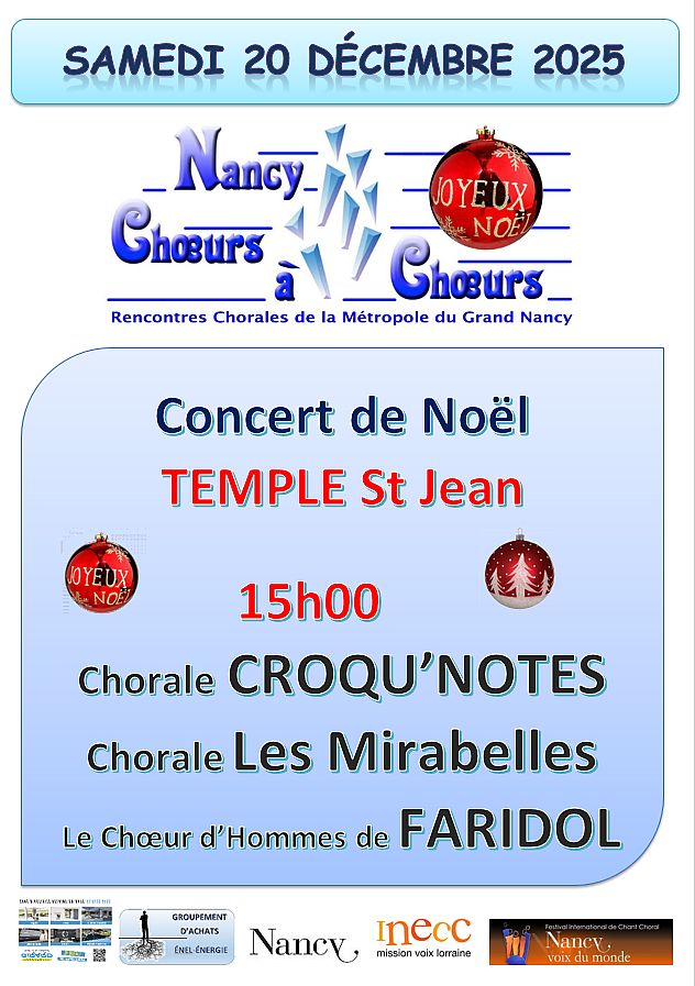 - 20 décembre, 15h à Nancy : Concert de Noël NCC au Temple St Jean